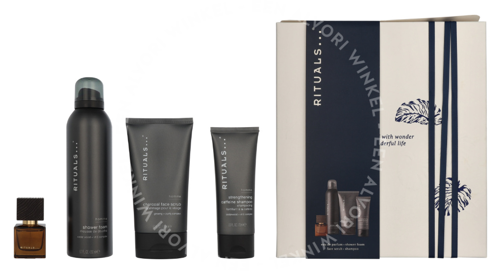 Rituals Homme Medium Giftset 410ml Charcoal Face Scrub 125ml/Shower Foam 200ml/Strengthening Caffeine Shampoo 70ml/Travel – L’Essentiel 15 ml
